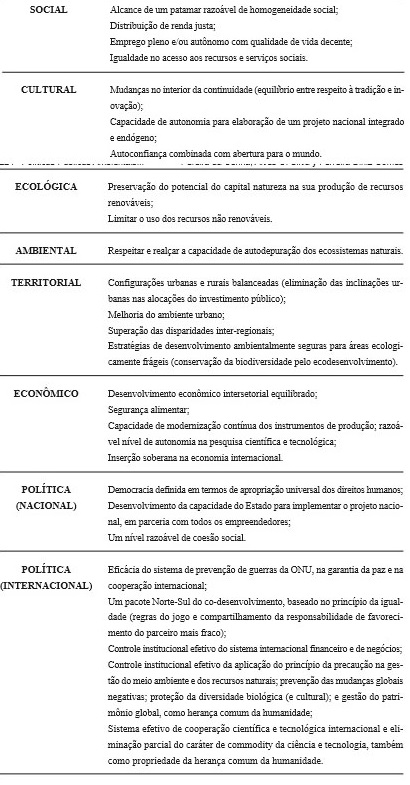 Nesse resumo, é importante apresentar abaixo o quadro 1 que traz o modelo de Sachs (Sachs, 2008) acerca do que seria o desenvolvimento sustentável influenciando diversos setores da sociedade e do Estado.