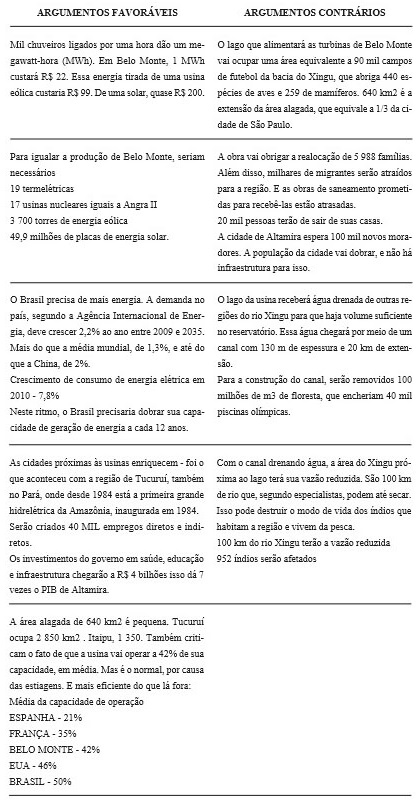 Quadro 2: Argumentos pró e contra a obra de Belo Monte