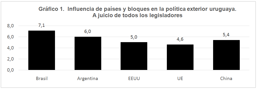 Los datos utilizados para el análisis de la cuarta hipótesis fueron extraídos de “Partidos políticos y política exterior en Uruguay (1985 – 2015). La importancia de las instituciones, las ideas y los intereses de los actores”, (2015), Tesis de Doctorado en Ciencia Política de Camilo López Burian. La encuesta de la cual se extrajeron datos fue realizada entre el 15 de junio y el 27 de diciembre de 2013, y se encuestó a 125 de los 130 legisladores, cubriendo un 96% del universo, sin tener desbalances relevantes en la distribución de las respuestas por partidos y fracciones. Los datos analizados corresponden a las percepciones de influencia de otros países en la política exterior uruguaya, analizando las respuestas del Parlamento como un todo y segmentando los resultados también por partido. Estas percepciones son tomadas como proxy de la influencia de estos países en los procesos decisorios en la política exterior uruguaya.