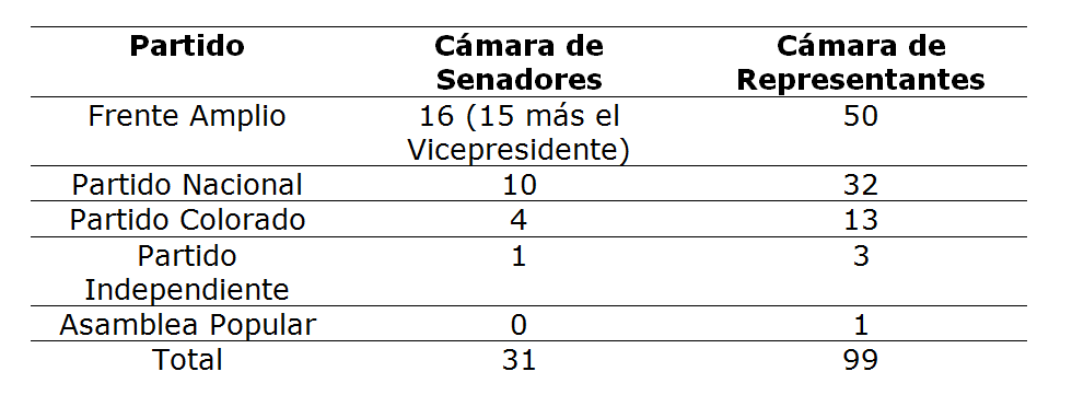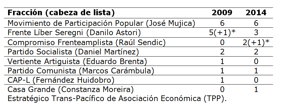 Nota (*): a los senadores electos en octubre debe sumarse el vicepresidente electo en el balotaje (Astori en 2009, Sendic en 2014)