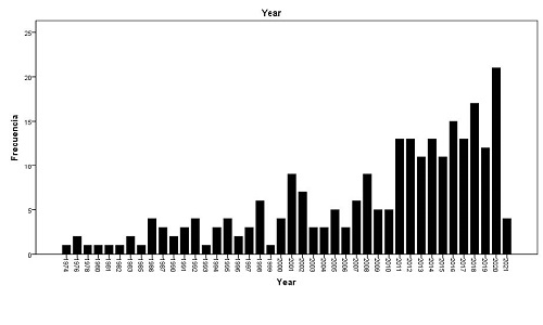 La búsqueda en SCOPUS arrojó, a fecha 31 de enero 2021, un número total de 248 documentos (n=248). Los años de registro de las publicaciones en total, abarcaron un período entre 1974 y 2021.
