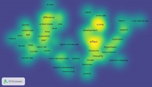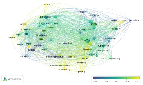 Conforme al overlay maps (Figura 1 ) que se visualiza, y en una búsqueda de co-ocurrencias de título/abstract, los estudios más antiguos, que corresponden a la tonalidad violácea, son aquellos en los que el homicidio se estudiaría en conjunto con el suicidio, y los más recientes, que corresponden a los de tonalidad amarilla), estarían referidos a los estudios sobre género (sector izquierdo del mapa), sobre los efectos políticos y sociales a nivel estructural (sector derecho del mapa).